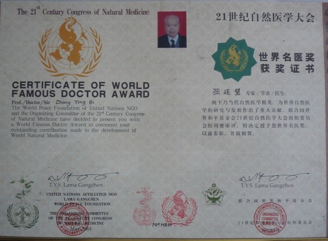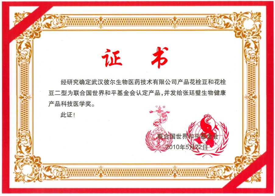 2010年5月22日,联合国世界和平基金会将“花栓豆”产品列入联合国世界和平基金会认定产品,并发给“花栓豆”发明人张廷璧教授“生物健康产品科技医学奖”。