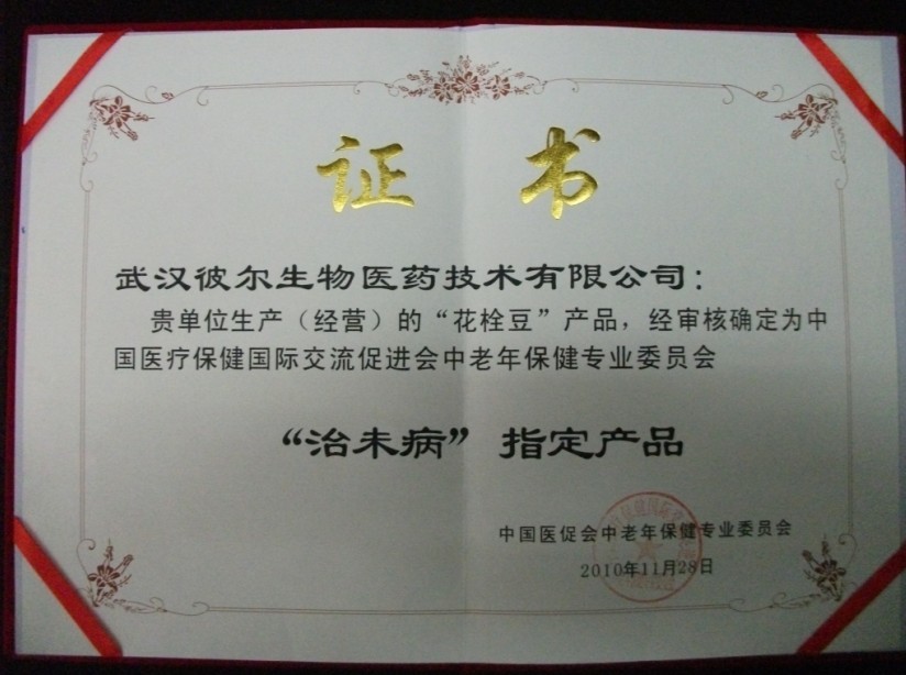 2010年11月28日,中国医疗保健国际交流促进会中老年保健专业委员会授予“花栓豆”产品为中国“治未病”指定产品。